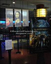 Plasmas acrílicos colgantes - phantom screens- ubicados en el ingreso a los cines Hoyts Abasto (Corrientes 3200) exhiben a uno de los cuadros más famosos del mundo, la imagen de la Mona Lisa, animada y en una actitud muy simpática, sonriendo y recomendando con gestos Una Noche en el Museo 2 , cuyo banner se encuentra a su lado.