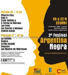 El Festival Argentina Negra II se realizará el sábado 26 y domingo 27 de septiembre, desde las 15 hs, en el ECUNHI, Libertador 8465, Capital Federal. Con entrada gratuita y hasta colmar capacidad.