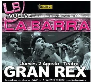 La Barra llega al Teatro Gran Rex el 2 de agosto para hacer cuartetear a la Calle Corrientes de la mano de Javier "Pepa" Brizuela (voz), Daniel "Nene" Guardia (voz), Carlos De Piano (bajo) y Adrián Moyano (timbaletas), los líderes de la banda más grande de Córdoba.