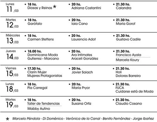 Laurencio Adot, Ara Intimates (Araceli Gonzalez), Holi (Dolores Barreiro), Susana Ortiz, Garófalo, Iaia Cano, María Gorof, Carmen Steffens, Francisco Ayala, Marcela Koury, Pía Carregal, María Pryor, Mabby Autino, cerrando el martes 19 de marzo a las 21.30 horas con la nueva colección del siempre vigente e innovador Claudio Cosano, que sorprende en cada cierre del tradicional evento de la Semana de la moda argentina.