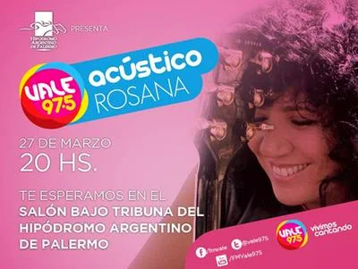 Este jueves 27 de marzo a las 20, Vale 97.5 presentará el recital de Rosana en el Hipódromo Argentino de Palermo, en la Ciudad Autónoma de Buenos Aires.