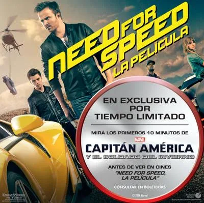 Hoy jueves 13 de marzo llega a los cines del país NEED FOR SPEED: LA PELÍCULA de Dreamworks Pictures; y en salas seleccionadas, la audiencia podrá disfrutar un adelanto exclusivo de CAPITÁN AMÉRICA Y EL SOLDADO DEL INVIERNO de Marvel.