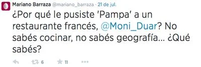 Desde hace un par de semanas, Mariano Barraza utiliza esa red social para criticar y denostar en 140 caracteres el servicio y la comida de "Pampa", el restaurante de Mónica (Morán).